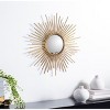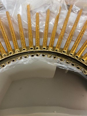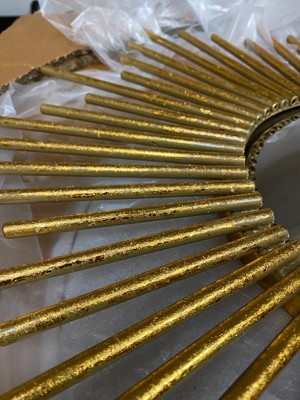Introducing our latest collection of reflective artistry � the Golden Radiance Mirror. Crafted with a robust iron frame, an unblemished glass surface, and a sturdy MDF backing, this piece is both functional and a striking addition to any decor. The radiant gold hue adds a touch of elegance that complements a variety of color schemes, making it a versatile choice for any room. Its design conjures the brilliance of the sun, with rays that expand outward, casting a warm, inviting glow across your space. Adorn your walls with this beautiful mirror that not only brightens your room but also reflects your exquisite taste. Transform your living area, bedroom, or hall with this stunning piece of art that doubles as a practical home accessory.