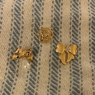 [This review was collected as part of a promotion.] A wonderful three piece brooch set. I chose to use these as shoe charms and it worked perfectly. I love that you have three options in my favorite is the heart. These are well made in a beautiful unique gold color. I love that my daughter and I can share these two jazz up our tennis shoes and give them a new style. These easily clip on so you don't have to worry about losing them. I received an incentive to write this review.