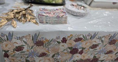 This disposable cover has a beautiful design. There's also small round plates and matching napkins the coordinate with the design. You can also have fun and combine with any of the following colors in the design: light blue, peach, blush pink, rose gold, purple. Design has a boho chic feel.