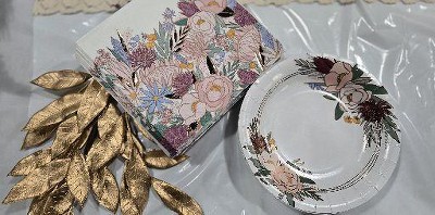 These are beautiful! Color scheme is unique and makes for endless combinations. I have purchased for many gatherings: using Gold, light blue, and even peach as the base color. There is a pretty rose gold detail in the pattern. Very nice! Enjoy