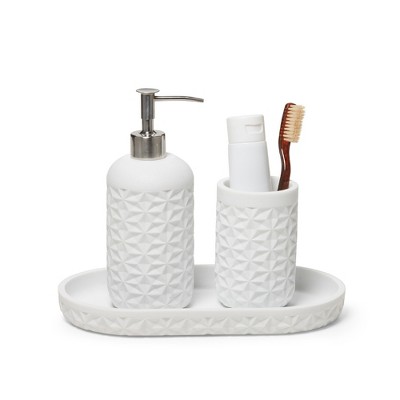 Includes: Soap/Lotion Dispenser, Bathroom Tray, Bathroom Tumbler