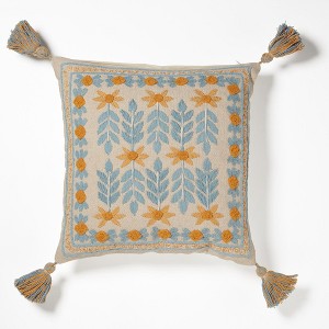 Blue sky hand embroidery with sunshine yellow on white canvas adds casual elegance to any room. Tassels. To clean, just wipe with a water dampened soft cloth. Roselli Trading Company’s accessories, including this, are designed, and made exclusively for us. Purchasing a Roselli brand product brings the genuine experience of staying at a five-star luxury hotel into your home.