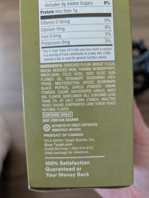 enriched flour (wheat flour, niacin, reduced iron, thiamin mononitrate, riboflavin, folic acid), high oleic sun- flower oil, rosemary seasoning (dex- trose, maltodextrin, spices [rosemary, black pepper], garlic powder, onion powder, sugar, dehydrated garlic, natu- ral flavor, sunflower oil), contains less than 2% of salt, corn starch, inactive yeast, sugar, evaporated cane syrup, yeast, natural flavor.' '