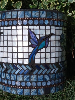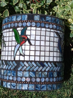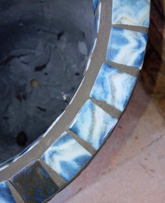 This pot is great for mosaic project-walls are straight and color is gray so there is no bleed thru like with terracotta. The pot has a drain hole and rubber plug if you don't want it to drain. The hole is great when handling a large project as a grip. The inner edge and top lip are thick enough that a full size strip of tile are mounted without trimming. This is glass tile, stained glass pieces and white shell tile with copper ball chain accent.