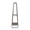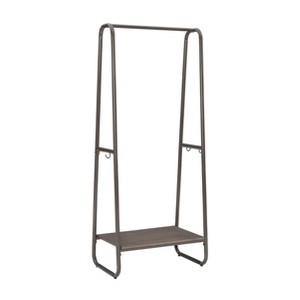 It’s time to do away with clutter and clothes draped over chairs and odd places! This minimal clothing rack provides an open canvas for your jackets, shirts, scarves and bags to hang front and center. Measuring at 25” L x 16” D x 60” H, this piece can make a big difference while taking up little floor space. The wooden bottom shelf in a distressed brown finish is perfect for storing folded laundry, shoes or bags, while 4 small hooks on both sides of the pewter metal frame offer extra hanging solutions. Easy assembly and confident style guaranteed.Overall Width: 25”Overall Depth: 15.75”Overall Height: 60”Shelf Width: 23”Shelf Depth: 15”Leg Height: 5.875”Shelf to Hook Height: 30.25”Top Width: 7.5”