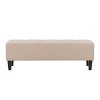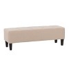 A trendy, yet versatile design - this bench completes the look for any entryway or bedroom space. Beautifully wrapped in a soft fabric, the comfortable seat cushion is home to gorgeous, button-tufted detailing with a unique, seamless design. Sturdy, tapered accent legs are finished in a dark stain that will complement any room's décor.
