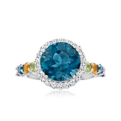 Round shape green peridot, round shape swiss blue topaz, round shape purple amethyst, round shape yellow citrine and round shape red garnet. Polished sterling silver.