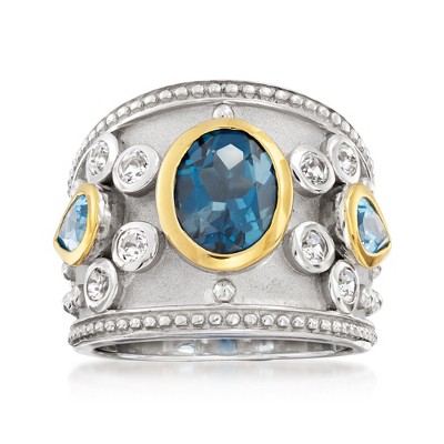 Polish off your ensembles with this ultra-chic statement! Crafted in polished 18kt yellow gold over sterling silver, this highway ring is adorned with 1.70 ct. t.w. oval sky blue topaz gems. 5/8" wide. Sky blue topaz highway ring. Stone InformationGem Type 1: TopazStone Cut 1: Good-CutStone Color 1: BlueStone Clarity 1: BlueStone Shape 1: Oval-ShapeStone Creation Method 1: NaturalStone Treatment Method 1: Heat-Treated,IrradiatedStone Weight 1: 1.70 CaratsNumber Of Stones 1: 2