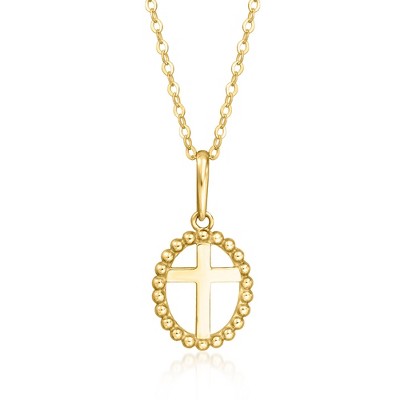 Express your faith in a classic style with this cross pendant necklace. It gleams in polished 14kt yellow gold for a timeless look. Rope chain includes a 2" extender. Springring clasp, 14kt yellow gold cross pendant necklace. Necklace drop length - 3/4 inch long. Necklace drop width - 3/8 inch wide.