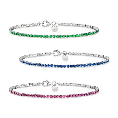 SIMULATED EMERALD AND CZ IN STERLING SILVER — 18.00 ct. t.w. simulated emerald and .60 ct. t.w. CZ bracelet in sterling silver. Emerald-cut simulated emeralds. Baguette and round brilliant-cut CZs. Polished finish. 7 in. long. 1/4 in. wide. Double-latch safety. Box clasp.