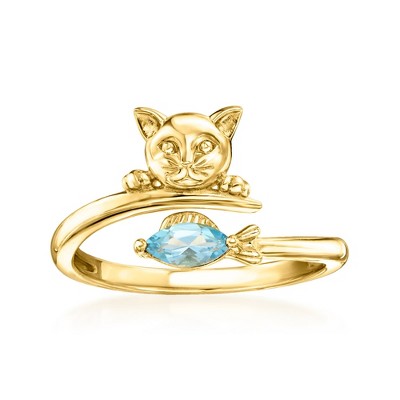 Don't you just wish you could bring your furry friend everywhere? With this adorable London blue topaz-accented cat ring, you'll be reminded of your favorite companion even in times spent apart! Crafted in polished 18kt yellow gold over sterling silver. 3/8" wide. London blue topaz cat ring. Stone InformationGem Type 1: TopazStone Cut 1: Good-CutStone Color 1: BlueStone Clarity 1: BlueStone Shape 1: Round-ShapeStone Creation Method 1: NaturalStone Treatment Method 1: Heat-Treated,IrradiatedStone Weight 1: 0.08 CaratsNumber Of Stones 1: 2