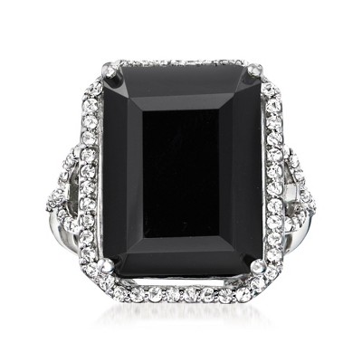 Jump-start your style with a big juicy gem! Our impressive ring features an ample 20.00 carat emerald-cut Swiss blue topaz bordered in bright white topaz rounds totaling .90 carats. Crafted in polished sterling silver and ready to steal the spotlight. 7/8" wide. White topaz and Swiss blue topaz ring. Stone InformationGem Type 1: TopazStone Cut 1: Good-CutStone Color 1: BlueStone Clarity 1: BlueStone Shape 1: Emerald-ShapeStone Creation Method 1: NaturalStone Treatment Method 1: Heat-Treated,IrradiatedStone Weight 1: 20.00 CaratsNumber Of Stones 1: 1Gem Type 2: TopazStone Cut 2: Good-CutStone Color 2: WhiteStone Clarity 2: WhiteStone Shape 2: Round-ShapeStone Creation Method 2: NaturalStone Treatment Method 2: Heat-Treated,IrradiatedStone Weight 2: 0.90 CaratsNumber Of Stones 2: 62