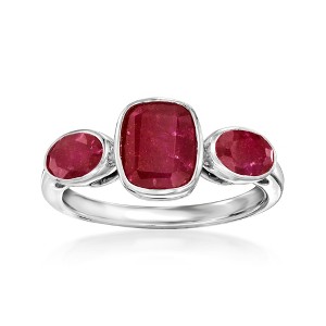 Who wouldn't love a classic design in fiery red? With three 3.30 ct. t.w. oval and rectangular cushion-cut rubies bezel-set in glossy sterling silver, this ring is bound to become a lifelong go-to. 1/4" wide. Ruby three-stone ring. Stone InformationGem Type 1: RubyStone Cut 1: Good-CutStone Color 1: RedStone Clarity 1: RedStone Shape 1: Rectangular-ShapeStone Creation Method 1: NaturalStone Treatment Method 1: Heat-TreatedStone Weight 1: 2.00 CaratsNumber Of Stones 1: 1Gem Type 2: RubyStone Cut 2: Good-CutStone Color 2: RedStone Clarity 2: RedStone Shape 2: Oval-ShapeStone Creation Method 2: NaturalStone Treatment Method 2: Heat-TreatedStone Weight 2: 1.30 CaratsNumber Of Stones 2: 2