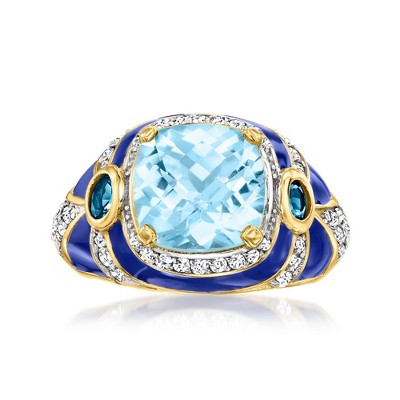 Big sparkle, small price! Our glamorous three-stone ring features 4.80 ct. t.w. square cushion-cut sky blue topaz gems in brightly polished 18kt yellow gold over sterling silver. 1/4" wide. Sky blue topaz three-stone ring. Stone InformationGem Type 1: TopazStone Cut 1: Good-CutStone Color 1: BlueStone Clarity 1: BlueStone Shape 1: Square-ShapeStone Creation Method 1: NaturalStone Treatment Method 1: Heat-Treated,IrradiatedStone Weight 1: 4.80 CaratsNumber Of Stones 1: 3