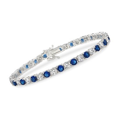 Treat yourself to the sensational hue and shimmer of sapphires. This tennis bracelet is lined with 7.90 ct. t.w. sapphire rounds, set in gleaming sterling silver and polished to a high shine. Figure 8 safety. Push-button clasp, sapphire tennis bracelet. Stone InformationGem Type 1: SapphireStone Cut 1: Good-CutStone Color 1: BlueStone Clarity 1: BlueStone Shape 1: Round-ShapeStone Creation Method 1: NaturalStone Treatment Method 1: HeatedStone Weight 1: 7.90-8.69 CaratsNumber Of Stones 1: 44-50
