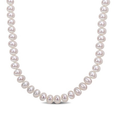 Reminiscent of the glamorous styles of the roaring 20's, our beautiful 9.5-10.5mm cultured freshwater pearl necklace is a must-have classic. Wear with your favorite little black dress or add it to a frilly blouse with a cardigan for a chic vintage profile - the possibilities are endless! Fastens with a 14kt yellow gold fishhook clasp. White pearl necklace. Pearl InformationPearl Type 1: Freshwater-CulturedPearl Minimum Color 1: WhitePearl Lustre 1: Medium-LusterPearl Shape 1: Semi-RoundPearl Uniformity 1: GoodPearl Surface Blemishes 1: Moderately BlemishedPearl Stringing Method 1: Moderately BlemishedSize Per Pearl 1: 9.5-10.5mmNumber Of Pearls 1: 9.5-10.5mm