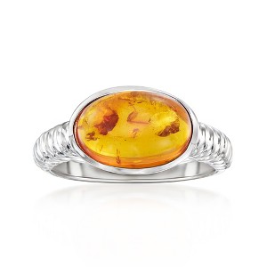Sweeten up any stack with the honey hues of this bright sterling silver ring, featuring a speckled 12x8mm oval amber cabochon on a simple band with twisted details. Natural inclusions in amber are unique and may vary. 3/8" wide. Amber ring. Stone InformationGem Type 1: AmberStone Cut 1: CabochonStone Color 1: OrangeStone Clarity 1: OrangeStone Shape 1: Oval-ShapeStone Creation Method 1: NaturalStone Treatment Method 1: Heat-TreatedStone Weight 1: 0 CaratsNumber Of Stones 1: 1
