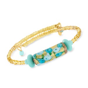 Artfully handcrafted in Italy, this charming wrap bracelet features petite golden-colored beads that lead to a large aqua Murano glass floral bead. At each side are more shapely beads in the same tonal palette, creating a pretty centerpiece. Murano glass is unique and may vary. Adjusts to fit most wrists. Features an 18kt yellow gold over sterling silver hang tag. Slip-on, aqua Murano glass floral bead wrap bracelet.