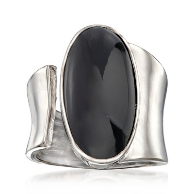 ITALIAN 14KT YELLOW GOLD AND BLACK ONYX — Italian black onyx mesh stretch ring in 14kt yellow gold. 8x6mm oval black onyx cabochon. Polished finish. 3/8 in. wide. Size large (fits sizes 9-10).