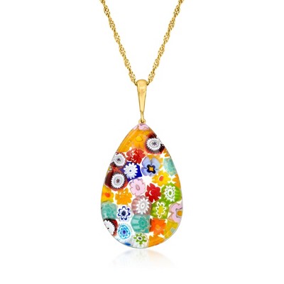 Better than any bouquet, our pretty and feminine pendant necklace is a heartfelt way to express your love. Made in Italy, the Murano glass heart features tonal pink roses and green leaves on a shimmering goldtone backdrop. Crafted in polished 18kt yellow gold over sterling silver. Singapore chain adjusts from choker length to 24" and finishes with a lobster clasp. Handcrafted Murano glass designs are unique and may vary. Multicolored Murano glass heart pendant necklace. Necklace drop length - 1 3/4 inches long. Necklace drop width - 1 1/4 inches wide.