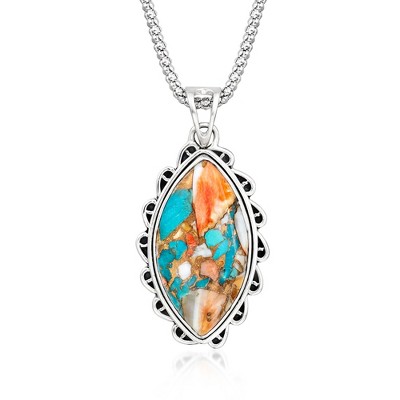 Revamp your personal style with a fresh pop of color! Perfectly cool and casual, our oxidized sterling silver pendant necklace presents a lively 18x35mm marquise cabochon mosaic of stabilized turquoise and colorful shell pieces, plus added copper that creates a dynamic matrix. Popcorn chain from Italy. Lobster clasp, turquoise pendant necklace. Necklace drop length - 2 inches long. Necklace drop width - 1 inch wide. Stone InformationGem Type 1: Stabilized-TurquoiseStone Cut 1: CabochonStone Color 1: BlueStone Clarity 1: BlueStone Shape 1: Marquise-ShapeStone Creation Method 1: NaturalStone Treatment Method 1: Dyed, StabilizedStone Weight 1: 0 CaratsNumber Of Stones 1: 1