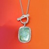 Sourced from the Holy Land of Israel, known for its archeological sites that date back to ancient times, this 18x14mm aqua Roman glass necklace is a colorful statement from a unique and fascinating piece of history. Framed in textured and polished sterling silver and suspended from a wheat chain with a toggle clasp for a contemporary look. Roman glass toggle necklace. Necklace drop length - 1 1/2 inches long. Necklace drop width - 5/8 inch wide.