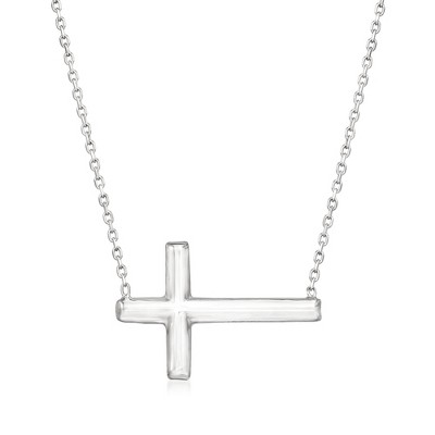 STERLING SILVER — Sterling silver sideways cross necklace. Polished finish. Cross measures 5/8 in. long by 1 in. wide. Suspends from a 16 in. long by 0.5mm wide cable chain with a 2 in. extender. 2.1 grams. Lobster clasp.