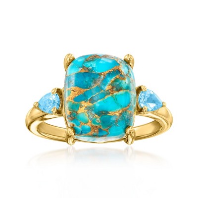 TURQUOISE, SKY BLUE TOPAZ AND 18KT GOLD OVER STERLING — Turquoise and .70 ct. t.w. sky blue topaz ring in 18kt gold over sterling. 6x12mm rectangular stabilized turquoise cabochon. Round sky blue topaz. Polished finish. 1/4 in. wide. Size 5.