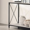 Give your living room or den a combination industrial-rustic appeal with Rosslea Lower Shelf Sofa Table. This table features a rectangular top in a gray finish with rustic wood grain details, with a metal frame and legs highlighted by an X-cross side design. The tables also come with an open bottom shelf for convenience and rivet details at the corners for rugged style.