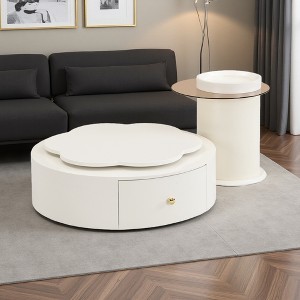 - (360-Degree Rotating Floral Top): The coffee table features a rotating flower-shaped tabletop, enabling easy access from any angle while adding a dynamic, stylish focal point.