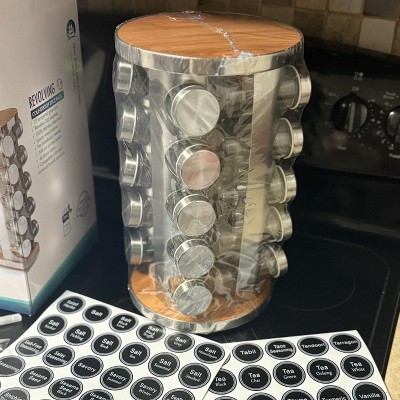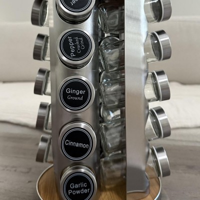 This is hands down one of the greatest and most beautiful Spice Rack! It's such an amazing quality and looks Amazing! The top and bottom has that luxury wood texture with stainless steel rack and lids. Has 20 glass jars and are perfect in size. Finally I have a spice rack that keeps most of my spices organized and within close reach. Thank you so much for this beautiful rack. I recommend it to anyone trying to keep their kitchen more organized.