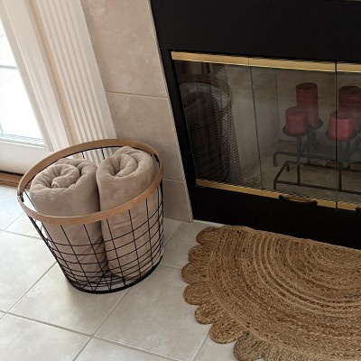 Add organization and decorative appeal to your living room, home office and more when you store everyday items in this Round Black Wire with Natural Wood Handles Floor Basket from Brightroom™. This round metal storage basket comes in a black powder-coated finish with contrasting double wooden top handles, providing a perfect addition to a variety of rooms in your home. The open top allows for easy access to the basket's contents, and wire sides provide visibility to what's inside. Set it on the floor near a sofa and stock with an extra throw blanket for guests, or place it near a bookshelf stocked with your family's favorite games.
