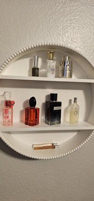 This round decorative wall shelf is so cute. It has a solid back so your items won't fall back and it gives a clean backdrop to your items. I used mine for perfume and cologne bottles. This is a children's shelf, but it can be used in any room, even the bathroom. It has a " pearl" trim all around. The space between the shelves is small, so be sure to measure figurines or picture frames if you want to use it for this reason. It's a good solid quality!