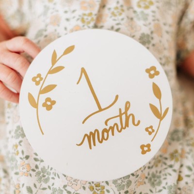 Complement your baby’s monthly milestones during their first year with the Round Monthly Milestone Cards from cloud island™. This set of six double-sided round milestone cards have a luxe look in white and gold-tone. Along with the numbers 1-12, each is embellished with a floral spring design and the word “months” in a script font. Simply place these cards next to your little one and snap a photo to remember those milestone moments.