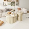This round coffee table set, consisting of one large and one small table, seamlessly blends style and functionality. Its table legs, crafted from unique wood grain vertical bars, exude a simple yet design - forward aesthetic while providing enhanced load - bearing capacity and stability. The classic color scheme allows the set to effortlessly integrate into diverse living room decors, making it a standout piece among other furniture. With no sharp corners, it ensures safety for all users, especially families with children. The two tables can be arranged in multiple configurations; use them side by side for a spacious surface or separately to meet different needs in various parts of the room. The combination of different sizes and heights perfectly addresses the varied table - size requirements in daily life. Additionally, the non - slip foot pads at the bottom prevent sliding and safeguard floors from scratches. Constructed with quality materials that emphasize both durability and visual appeal, this coffee table set is a versatile and reliable addition to your home, offering a harmonious balance of aesthetic charm and practical use.