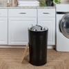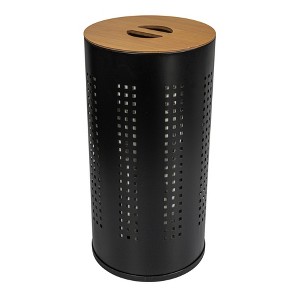 - Matte black steel laundry hamper with wood lid in a natural finish and integrated handle
