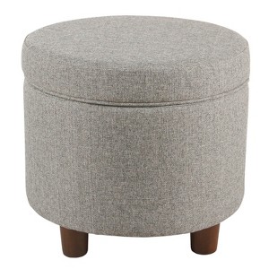 This modern round ottoman features a lift-off lid for convenient storage. Upholstered in textured tweed fabric with welting on the lid, this mid-century ottoman has wood legs in a complementary finish. Use this multifunctional storage ottoman to hide accessories in a bedroom, to store books or magazines in a living room, or to keep controllers or remotes nearby but out of sight in a family room. Pair two together for added impact. This ottoman is available in a variety of colors and is easy to assemble and maintain. Please note that fabric and wood colors may appear slightly different due to variations in lighting or screen settings.