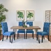 - Button-tufted chair details and dark espresso-finished legs provide a sophisticated look that complements the table.