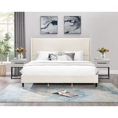 Roundhill Furniture Vichy 3-Piece Rubberwood Bedroom Set, Platform Bed with Two Nightstands, Beige Textured Polyester King