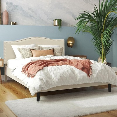 Roundhill Furniture Vichy Rubberwood Platform Bed in Light Walnut Cream Corduroy Queen