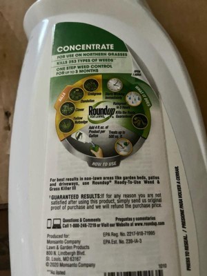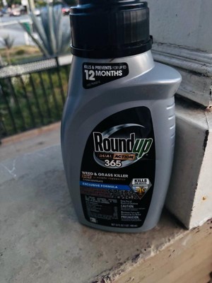 Roundup® Dual Action 365 Weed & Grass Killer Plus 12 Month Preventer Concentrate provides one-step weed protection for up to 12 months. This weed control kills and prevents many types of tough weeds and grasses for up to 12 months, including clover, dandelion, large and smooth crabgrass, poison ivy, and other broadleaf weeds, grassy weeds and brush. It is rainproof in as fast as 30 minutes and produces visible results in hours. Use Roundup® Dual Action 365 Weed & Grass Killer Plus 12 Month Preventer where you want to kill existing weeds AND prevent new weeds for up to 1 year, such as cracks and crevices in driveways, sidewalks, and walkways, patios, paths, and under decks, gravel areas, and other non-lawn areas. Mix the concentrate according to label directions and spot treat or spray evenly each gallon of spray solution over 300 sq. ft. with a tank sprayer. Please note, to prevent new weeds and grasses from growing, YOU MUST SPRAY THE ENTIRE AREA you want to control, NOT JUST the emerged weeds. One 32 fl. oz. bottle makes up to 5.3 gallons (see booklet for mixing instructions) and covers up to 1,600 sq. ft.