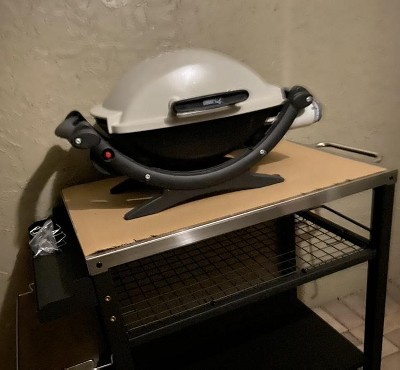 Bought the table for a portable Weber gas grill that was gifted to us. It fit well with some room around it. It required assembly. The steps were easy to follow. All the parts were included with a couple of spare screws. It is sturdy and rolls well. The first shelf is removable if needed. The paper towel hanger and garbage bag holder are a nice addition. Delivery came 3 days before it was expected. Cost was a bargain for an all metal well made cart.