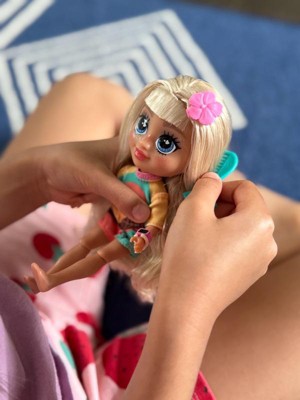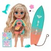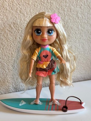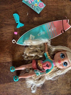 [This review was collected as part of a promotion.] This cute little doll comes with a surfboard and sandals plus a comb and a cute little sticker sheet. You can place her on the surfboard put her in the bathtub like she's surfing or you could just play with a doll , all little girls will love her.