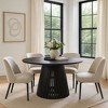Bring cutting-edge style and effortless modern panache into your dining room, and give your intimate dining experiences with friends, family, and guests an unforgettable contemporary feel with the gorgeously handcrafted dining table from our Ridge collection. This piece comes uniquely designed with a one-of-a-kind slatted wood construction at its base, and it is comprised of multiple wood slats that are artfully turned, tilted, and repeated in a dazzling circular pattern. The natural mango wood grain details are finished in a classy, tasteful jet-black coloration to accentuate but not overwhelm. Order today from our premier Ridge collection and imbue your interior decor with subtle touches of luxury, modernism, and charisma.