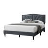 Bring elegance to your bedroom with our Reo queen size bed, featuring a gracefully sloped headboard with intricate curved stitching and a refined nailhead border. Wrapped in soft charcoal gray burlap fabric, it offers a sophisticated touch, complemented by a streamlined footboard and black tapered legs. Sturdy slats with center support ensure durability. Explore more in our Reo collection.