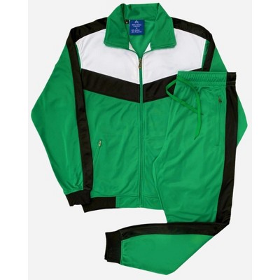 Full Zip up Track jacket 2 zippered side pockets 250 GSM durable track material for long term wear with a soft internal lining for comfortStraight bottom track pants with adjustable drawstrings at ankle, 2 zippered side pockets and an adjustable elastic waist with drawstrings