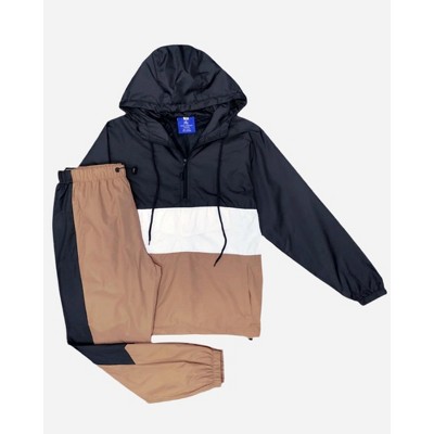 Matching track pants with 2 zippered side pockets, an elastic waistband with drawstrings and drawstrings at ankle to pull for a jogger style look