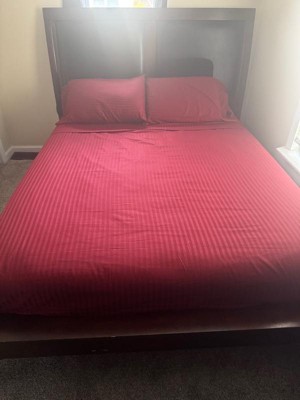 [This review was collected as part of a promotion.] I love the beautiful burgundy color on this set & the stripes add some detail so it doesn’t fall flat. The fit was perfect even with the thin pillow topper I have on my mattress. Very comfortable to sleep on, my cat even thought so which brings me to my next point that cat fur clings to it lol but that’s with most sheets. Very stunning set.