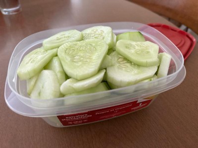 [This review was collected as part of a promotion.] I use it to store my fruits and veggies as you can see in the pictures it holds a lot of chopped up cucumbers. Easy to store fits inside the fridge. There’s no plastic scent, gets the job done.