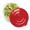 - Food storage containers have updated, more durable lids in a bright ruby red
